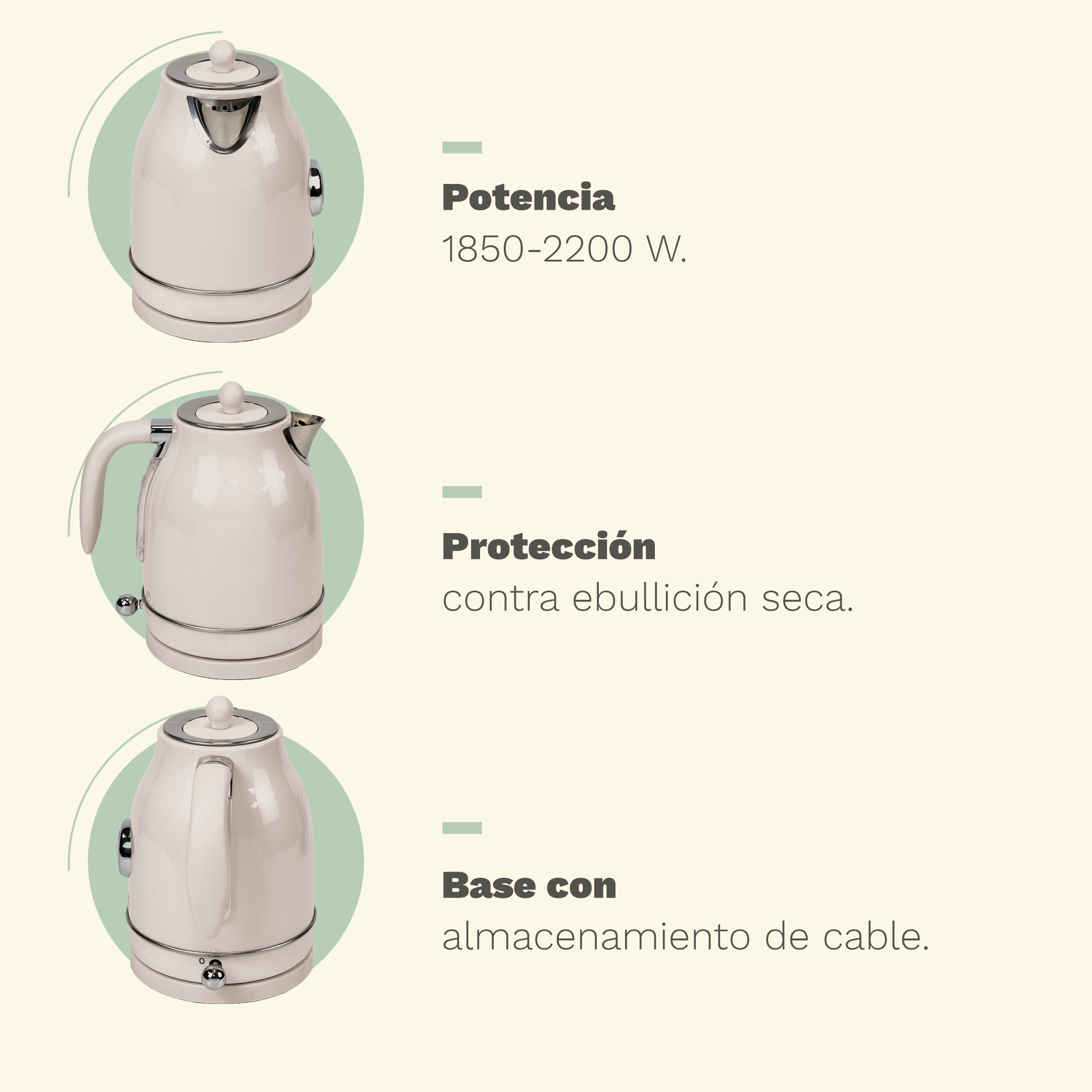 Con un rango de 1850 a 2200W, su sistema de ebullición rápida te asegura agua lista en solo minutos.